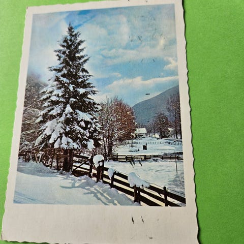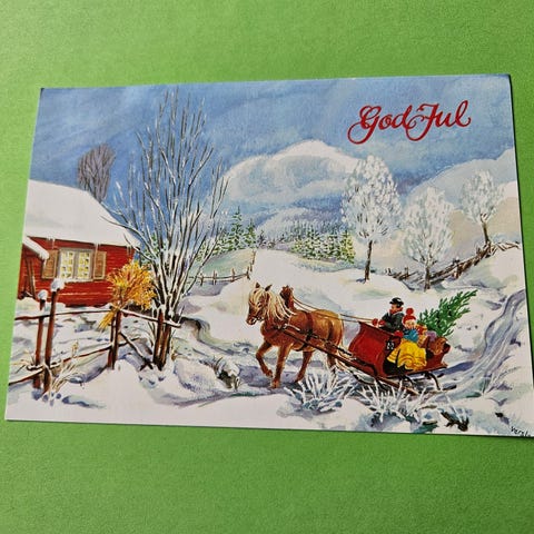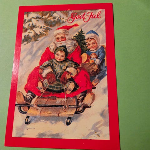 Julekort 2 jenter ute med pakker på kjelke