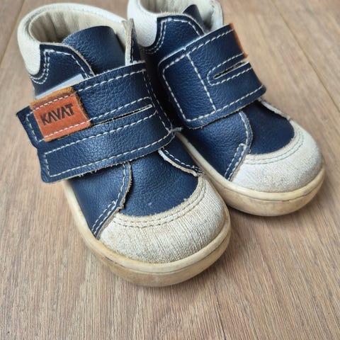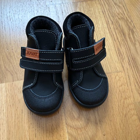 Kavat barnesko unisex i størrelse 20. Skoene har svart overdel med lyse detaljer og hvit såle. De lukkes med borrelås over vristen for enkel av- og påkledning. Yttersålen er mønstret for bedre grep. Passer til hverdagsbruk for små barn.