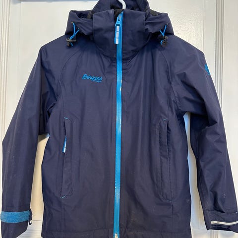 Bergans jakke for barn i størrelse 140. Jakken er blå med oransje detaljer og har avtagbar hette. Den har glidelås i front, glidelåslommer i siden og justering nederst. Innsiden har nettingfôr. Refleksdetaljer gir bedre synlighet. I fin stand. Selges for kr 250,-