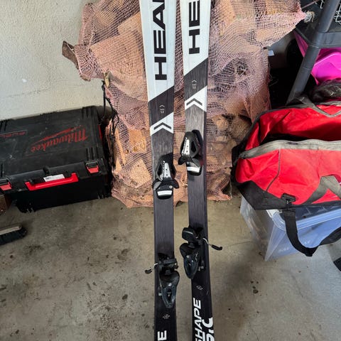 Head alpinski og skistøvler i matchende farger. Skiene har integrerte bindinger og er egnet til vanlig alpinkjøring i bakke. Toppene er hvite med gule og svarte detaljer og tydelig Head-logo. Undersiden er sort.