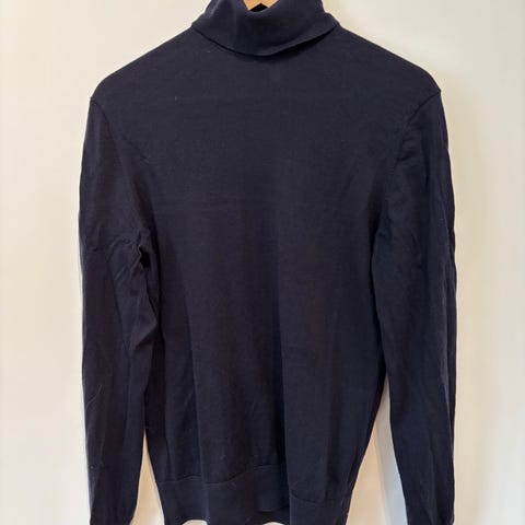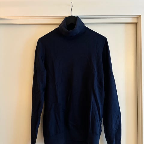 SAND Copenhagen genser for herre i størrelse M. Genseren er mørkeblå og strikket i 100 % merinoull. Den har rund hals med ribbestrikket kant, samt ribbestrikkede mansjetter og linning. Passer til hverdagsbruk eller som et lag under jakke eller blazer.