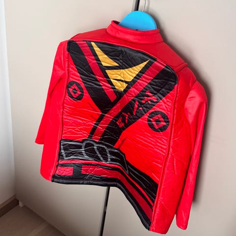 LEGO Ninjago kostyme i rød farge for barn. Kostymet består av overdel med Ninjago-motiv foran og bak, samt rød hjelmmaske og hansker/legohender. Egnet som utkledning eller karnevalskostyme for barn som liker LEGO Ninjago-universet.