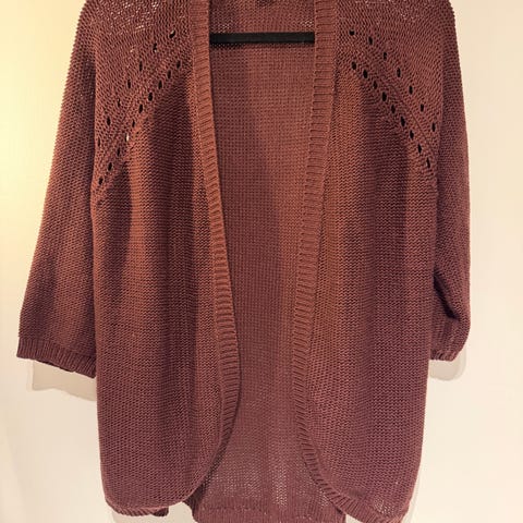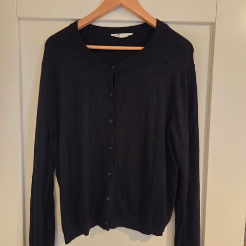 H&M Basic cardigan for dame i størrelse L. Cardiganen er blå og laget av bomull. Modellen har lange ermer og knepping foran. Passer som et enkelt basisplagg til hverdagsbruk, og kan brukes over topp, skjorte eller kjole for ekstra lag og komfort.