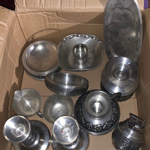 Div pyntegjenstander i tinn ! Boller , fat , små vaser og tinnkanner og suppe terrin selges helst samlet for 1000 kr ! Kan hentes i Drammen, eller sendes , kjøper betaler frakt