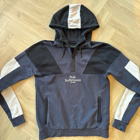 Peak Performance hettegenser for herre i størrelse M. Genseren er blå og laget i bomull. Den har hette, kengurulomme foran og ribbestrikkede kanter nederst og på ermene. Logo og «Peak Performance Est. 1986» er trykket på brystet. Passer til hverdagsbruk og fritidsaktiviteter.