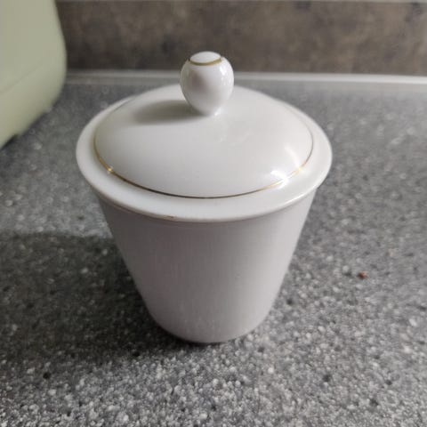 Porcelanal porselenskrukke med lokk i hvit glasur med gullfargede detaljer. Krukken har rund form med svakt mønstret overflate og gullkant øverst og nederst. Lokk med rund knott og matchende gullkant. Egnet til oppbevaring på kjøkkenet, for eksempel sukker,
