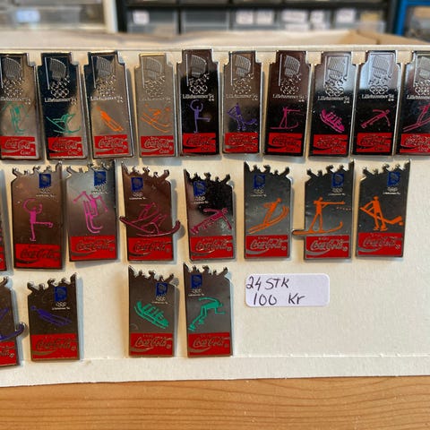 Coca-Cola USA OL 1994 pins samling. Flere emaljerte pins med motiv fra ulike idretter og USA Olympic Team, blant annet boksing, bryting, friidrett, baseball, fotball og svømming. Motivene kombinerer Coca-Cola-logo, USA-flagg og OL-ringer. Pinsene er i metall med emalje i hovedsakelig rødt, hvitt, blått og gull. Egnet for samlere av OL-effekter, Coca-Cola-merchandise eller pins.