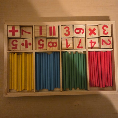 Pedagogisk hjelpemiddel for trening i tallbegreper. Ligger i god tre-eske. Komplett innhold