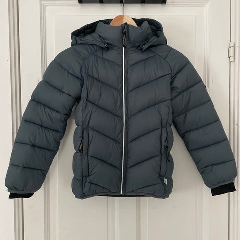 Jakken, som er okergul, ser nærmest ubrukt ut. Størrelse 134, passer like godt til gutt som jente.