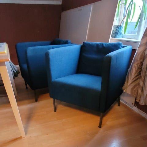 To stoler fra IKEA gis bort. Vi har tidligere arvet de, under trekket er de hvite og flekkete. Jeg har farget trekkene svarte. Begge stoler er flekkete og trenger en skikkelig vask, de er også blitt hvite etter saueskinn. Slitt på ene armlenet. Trekkene kan tas av for vask. Må hentes raskt!