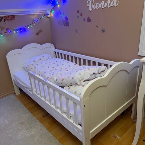 Veldig fin seng som passer godt inn på de fleste barnerom. Den er stor nok til at det er plass til voksendyne, men uten å føles altfor stor til en liten kropp.