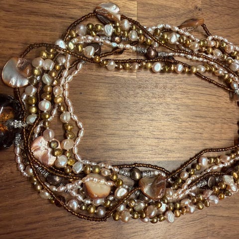 Eksklusivt smykke med flotte perler i rosa og lilla perler i forskjellige størrelser.