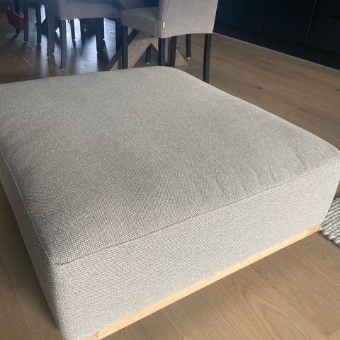 Puffen er pent brukt, ca. 1 år gammel, og fremstår som som ny. Ingen synlige slitasjer eller merker. Elegant og tidløs modell som passer godt både som fotskammel, ekstra sitteplass eller som et mykt salongbord med brett.
