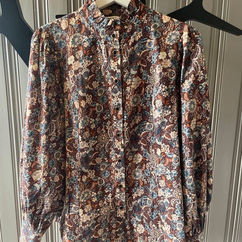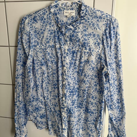 Holly & Whyte bluse for dame i størrelse S. Blusen er flerfarget med blomstrete mønster på blå bunn. Den er laget av bomull og har lange ermer med mansjetter. Fronten har rynke- og foldedetaljer, og blusen har rund hals. Egner seg til hverdagsbruk og kan kombineres med både bukser og skjørt.