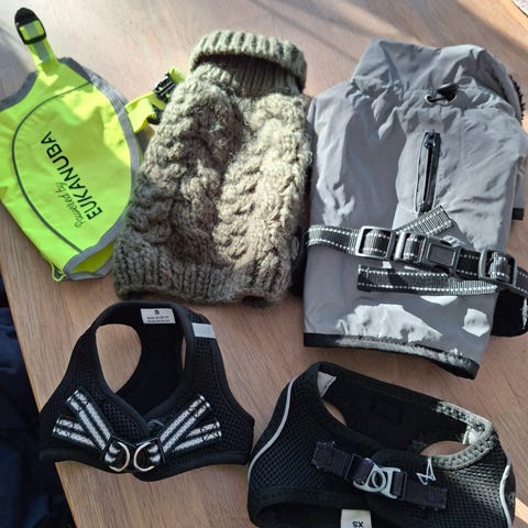 Diverse hundeutstyr selges billig. Litt forskjellig, men mest klær som genser og trekk med og uten foring. Har vært brukt til store og små hunder, har forsøkt ta bilde av alle størrelser. Mulig rekkefølgen på bildene har blitt rotet til ved opplasting..