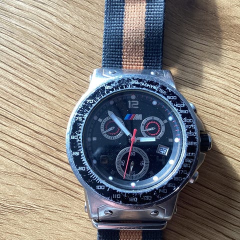 Pent brukt herre ur. Må ha nytt batteri. Bruksanvisning og BMW eske medfølger.