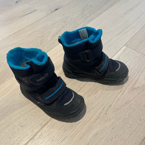 Superfit vintersko for barn i størrelse 25. Skoene er unisex og har overdel i tekstil og syntetisk materiale i blå og mørke toner. De har to borrelåsstropper som gjør det enkelt å ta skoene av og på, samt grovmønstret yttersåle for bedre grep. Passer til bruk i kaldere vær og til hverdagsbruk ute.