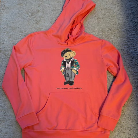 Ralph Lauren Polo hettegenser unisex størrelse L. Genseren er grå og har glidelås i front, hette med snøring og kengurulommer. Liten Polo-logo på brystet og stort trykk på ryggen. Passer til hverdagsbruk og fritid.