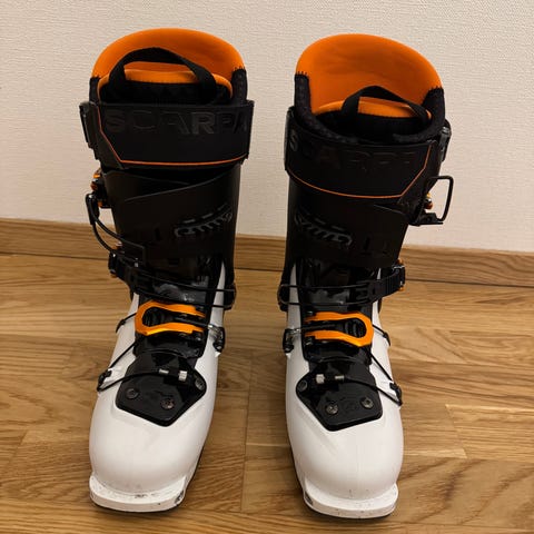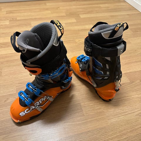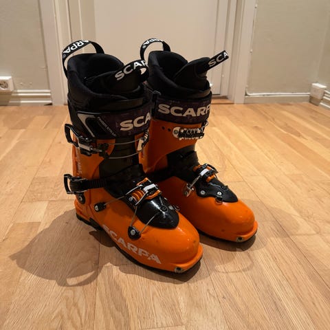 Scarpa Maestrale toppturstøvler i oransje med svarte og grå detaljer. Støvlene har gåfunksjon og flere spenner for justering og god passform. Sålen har kraftig mønster for feste ved gange.