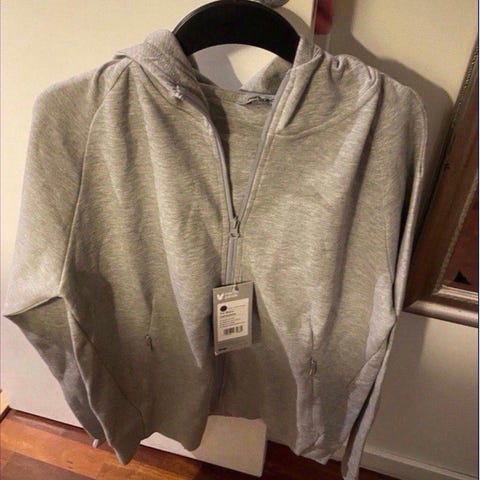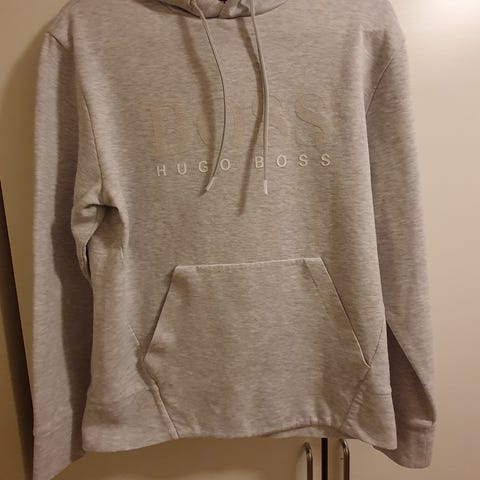 Hettegenser for herre i størrelse M. Genseren er grå og har et blomstertrykk på brystet. Modellen har hette med snøring og stor kengurulomme foran. Passer til hverdagsbruk og fritid.