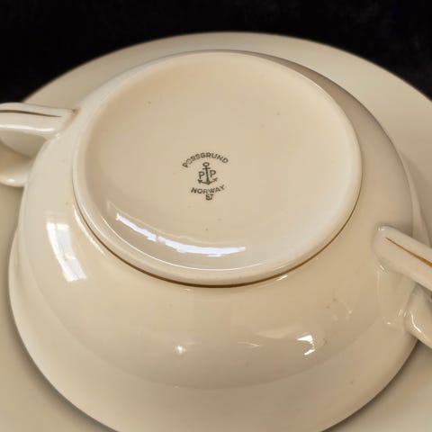 2 nydelige Consommé-skåler m/underskåler fra K.P.M, Germany + 2 ekstra underskåler uten kopp.