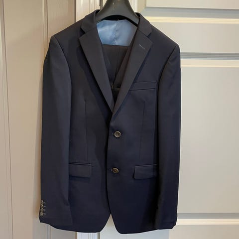 Frislid dress i størrelse XS. Dressen består av jakke, bukse og vest i blå farge. Hovedstoffet er en ullblanding med 50% ull og 50 % polyester. Jakken har to knapper foran, jakkeslag og lommer med klaff. Buksen har press og to baklommermed knapp. Vesten har knappelukking foran og to frontlommer, spenne bak.