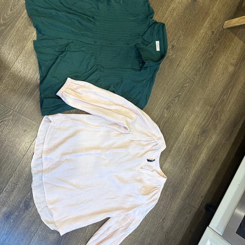 Avslappet modell med lave skuldre. Bluse i størrelse L eller XL. Shorts i størrelse S eller M. Pris for 2 deler 100 kr.