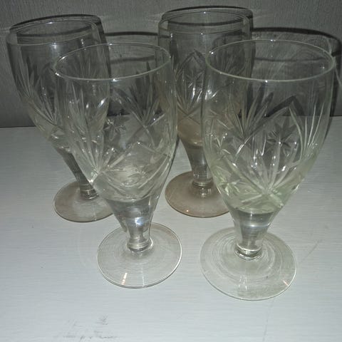 11 fine krystall stettglass selges samlet. Tok bare bilde av 3 glass, men jeg har 11. De er 16,5 cm høye og ca 5 cm i dia på toppen. De rommer ca 1 dl. De er ikke merket og jeg kjenner ikke til produsenten.