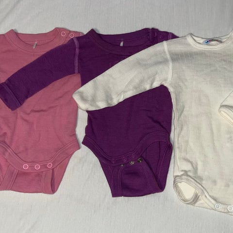 Myk og god ull fra Reflex inkl. en pysj / heldress og en body fra Woolland. Det fra Reflex er pent brukt uten anmerkninger. Ullbodyen fra Woolland har noen små hull bak, se bilde.