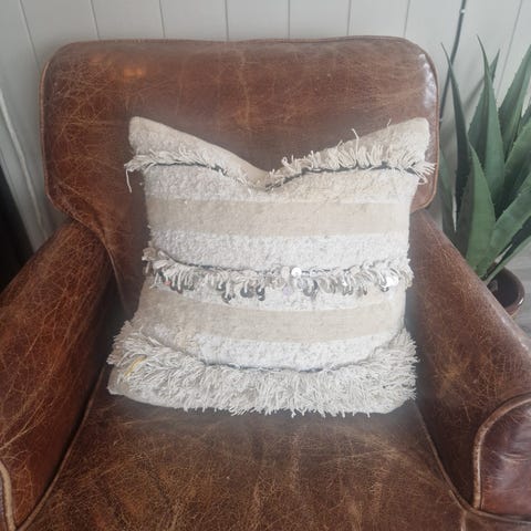 Pyntepute sydd av gamle antikke melsekker i lin. Hver gård hadde sitt mønster og sine farger for å skille hverandres mel ved kvernen. Rutemønster i beige og gule toner. Den ene puten med rosa felt og den andre med litt rødere tone. Passer godt sammen eller hver for seg. Dunpute inni som følger med kjøpet.