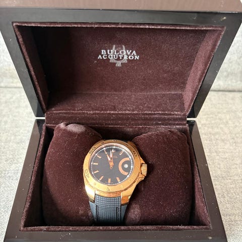 Selger en kronografisk klokke fra Bulova. Stål og rosegull på utsiden. Svart på innsiden.