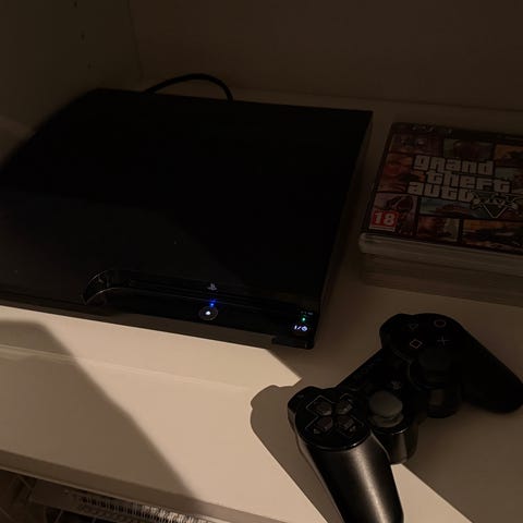 Sony Playstation 3 spillkonsoll i svart farge med tilhørende trådløse håndkontroller. Konsollen er egnet for avspilling av Playstation 3-spill, film og annet multimediainnhold, avhengig av tilkoblet utstyr og programvare. Passer for bruk med kompatible PS3-spill og tilbehør.