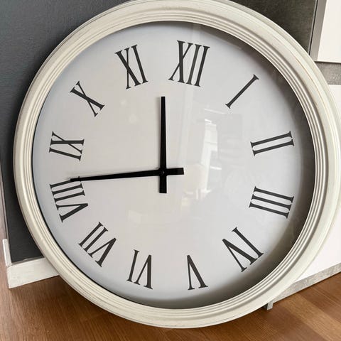 veggklokke, stor klokke, interiør, dekor, romertall, vintage, klassisk, landlig, farmhouse, fransk landstil, shabby chic, stue, kjøkken, gang, dekorasjon