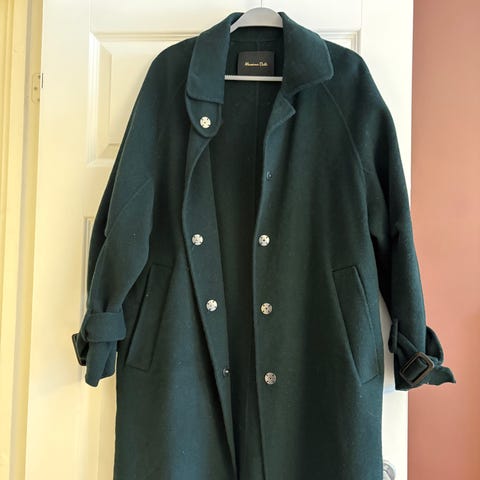 Mørkeblå kåpe, smal i fasongen. Litt innsvinget. Står str 40 EUR. Jeg vil si den er 36/38 str. Lengde fra armhule og ned 85 cm. Armlengde fra skulder og ut 60 cm. Skulder sø til søm på rygg 40 cm. Midje 47 cm.