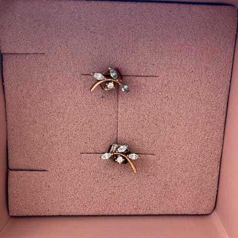 Tre ringer og et par øredobber som festes opp etter øret. Kjempe fint sett, men selges da jeg ikke får anledning til å bruke det så mye. Kun brukt under en anledning.