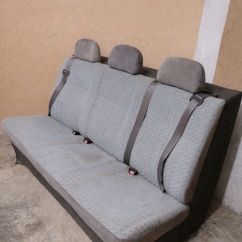 Dobbel bilseterad med integrerte hodestøtter og ett midtmontert trepunkts sikkerhetsbelte. Setet er trukket i grå tekstil med mønster og har grå vinyl på baksiden og sidene. Understellet er i metall med festeanordninger for montering i bil. Egnet som baksete eller ekstra seterad i varebil, minibuss eller annen kjøretøyinnredning der det er tilpasset for denne typen sete og festesystem.