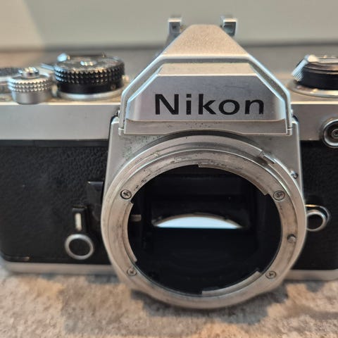 Canon AE-1 speilreflekskamera for 35mm film i svart og sølv. Mekanisk/elektronisk SLR-kamera med utskiftbar objektivfatning (FD-fatning), manuell fokusering og optisk søker.