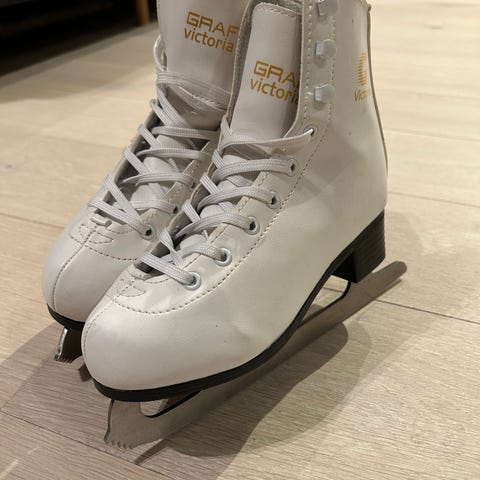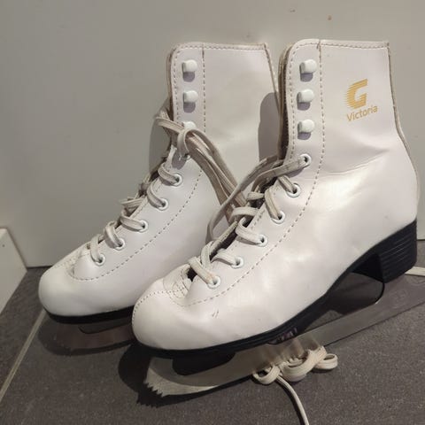 Graf Victoria kunstskøyter i størrelse 39. Klassiske hvite skøyter med snøring og støttende ankelparti. Overdel i syntetisk materiale med polstret innside for økt komfort. Skøytene har fastmontert stålblad egnet for kunstløp og generell skøytebruk på isbaner og frosne vann. Passer til barn eller ungdom med skostørrelse 39, avhengig av fotbredde og sokketykkelse.