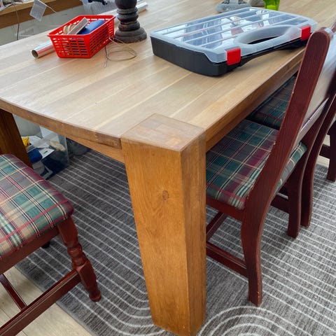 Stolene har polstret sete og rygg med knappestikninger/tufting. Trekk i lyst tekstil og ben i tre. Settet passer til vanlig spiseplass i hjemmet, for daglig bruk eller til selskap og måltider med flere personer. NB: stoler bør renses og der er klore merker fra katt på noen av de. Der medfølger 6 stoler til info. Må hentes Drammen på Åskollen