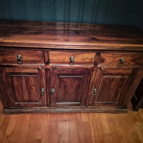 Pent brukt Bombay reol med lys. Har en veldig liten skade på toppen av skapet. Har motert lys inni. Må hente og bære selv. Er tung da det er reint treverk. Skapet er nå liggende ( se bilder) da det ikke takhøyde.