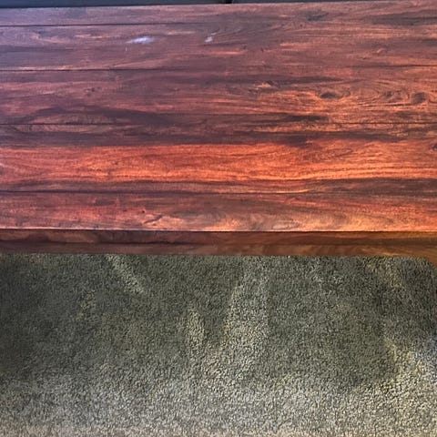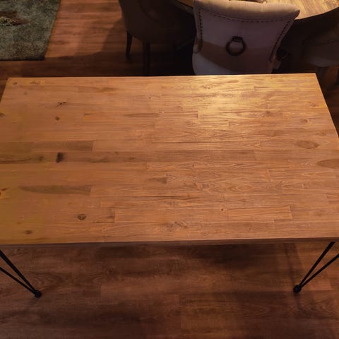 Brunbeiset bordplate og hvite bein. Heltre.