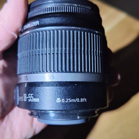 1: Canon EF-S 55-250mm f4-5.6. Brukt en grei del, og lager en liten lyd når autofokus brukes men ellers fungerer den som den skal.