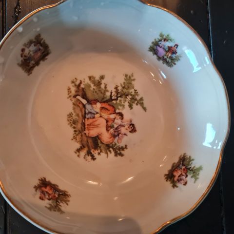 Rosenthal porselensbolle med fot og hanker i gullfarge. Bollen har avlang, buet form og står på en dekorert sokkel. Utsiden har relieffdekor med motiv, mens kant, fot og hanker er dekorert med gull. Innsiden er glatt og lys. Egnet som pyntegjenstand, serveringsbolle eller fruktbolle på bord eller skjenk.