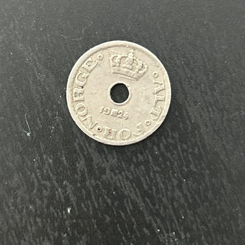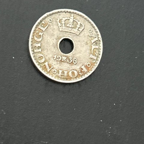 Norge 10 øre mynt 1937 med hull i midten. Forsiden har krone og teksten "Norge" samt årstall 1937. Baksiden viser valøren 10 øre med to ornamenter. Mynten er preget i lett metall (typisk nordisk myntmetall). Egner seg som samleobjekt for norske mynter eller som del av en myntsamling fra 1900-tallet.