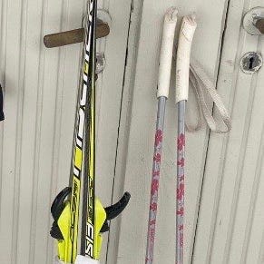 Rossignol felleski og Fischer smørefrie langrennski med ett par staver.