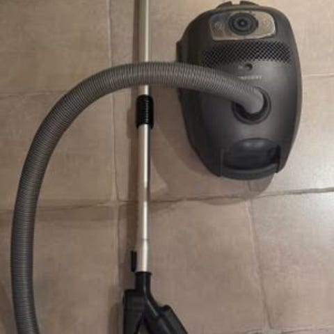 Electrolux støvsuger med teleskoprør i metall og svart støvbeholder. Modellen har slange med håndtak og standard gulvmunnstykke som egner seg til rengjøring av harde gulv og tepper. Støvsugeren har betjeningsknapper på toppen av enheten og indikator for støvpose. Passer til vanlig husholdningsbruk i leilighet eller hus.