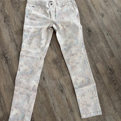Mos Mosh bukse for dame i størrelse M. Buksen har flerfarget blomstermønster på lys bunn, med detaljer som glidelåslomme bak og dekor ved lommene foran. Passform og materiale fremstår som en klassisk, vevd bukse egnet til hverdagsbruk eller mer pyntede anledninger. Kan kombineres med både enkle topper og jakker for ulike uttrykk. Str.29 tommer.