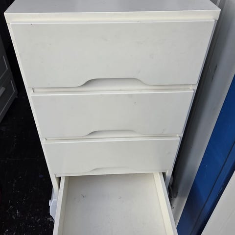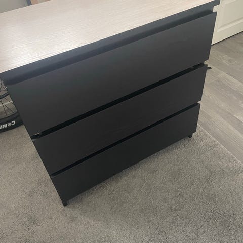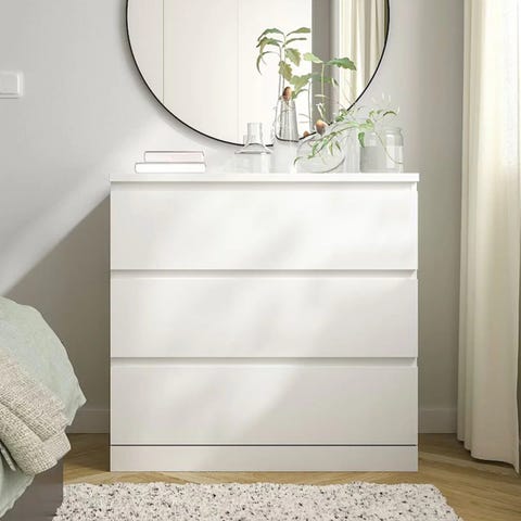 IKEA kommode med tre skuffer i hvit utførelse. Kommoden har klassiske frontpaneler og buede håndtak i metall på hver skuff. Egner seg til oppbevaring i for eksempel gang, soverom eller bod. Utført i malt tre eller trefinér/plateverk (detaljert materiale ikke oppgitt). Kommoden er frittstående og har rektangulær toppflate som kan brukes til ekstra avlastningsplass.