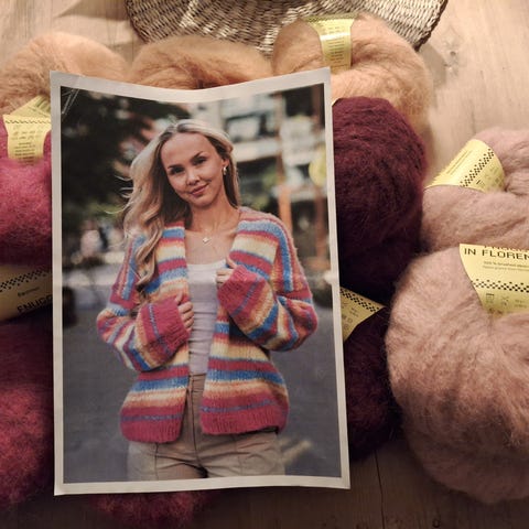 Fnugg in Florence til Shirley stripejakke ifra Bystrikk. Garnet består av 100% børstet alpakka. Noe som gir lette og myke plagg. Garnet er til str. M. Overvidde på jakken er 112 cm. Strikkefasthet 12 masker. Jakken strikkes på pinne 6 og 7.