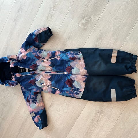 Reima parkdress for jente i størrelse 110. Dressen er rosa med mønster på overdel og mørke felt på bena. Yttermaterialet er Gore-Tex, som er vanntett og vindtett samtidig som det puster. Dressen har hette og lange ermer, samt lange ben med forsterkede partier nederst. Egnet som yttertøy i vått og kaldt vær for barn i ca. størrelse 110.